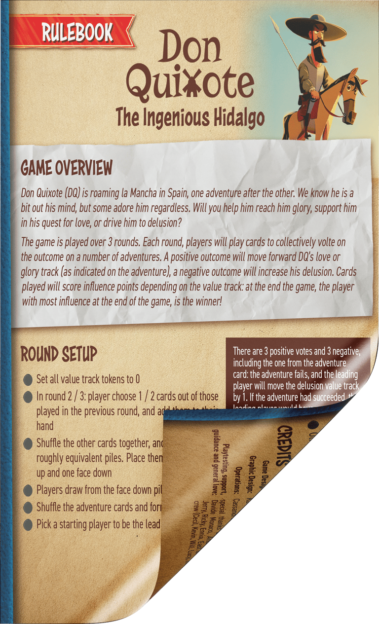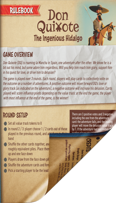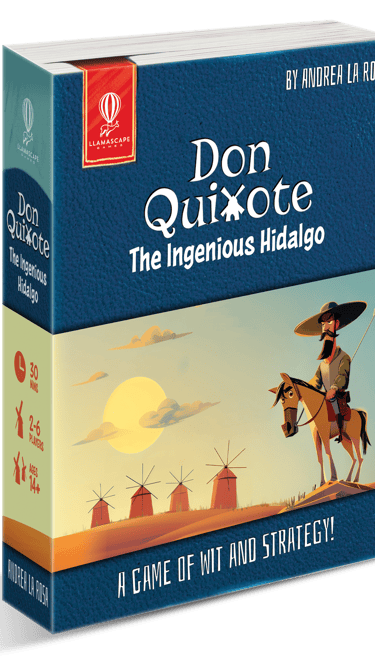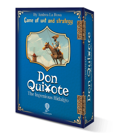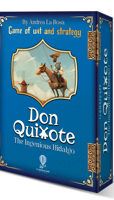 I designed box and rules for "Don Quixote, the ingenious hidalgo: a game of wit & strategy". It's a card game based on the famous novel from Miguel de Cervantes, Don Quixote that will be soon on Kickstarter!