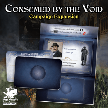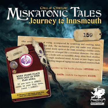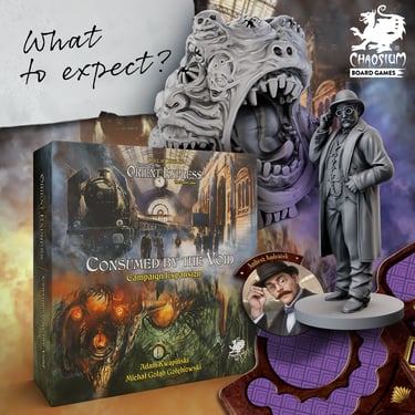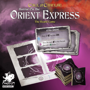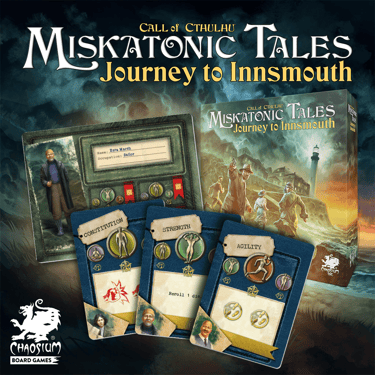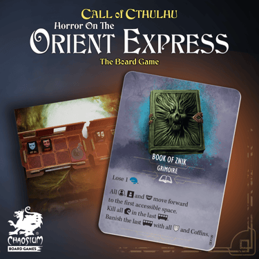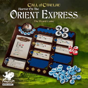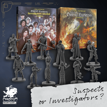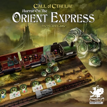 Instagram post designs for "Horror On The Orient Express" and "Miskatonic Tales" tabletop games by Chaosium Board Games.