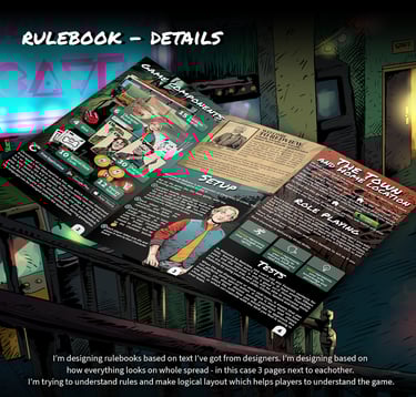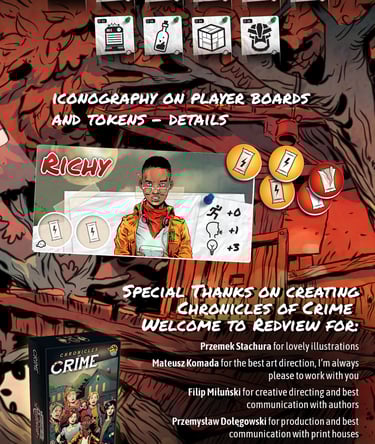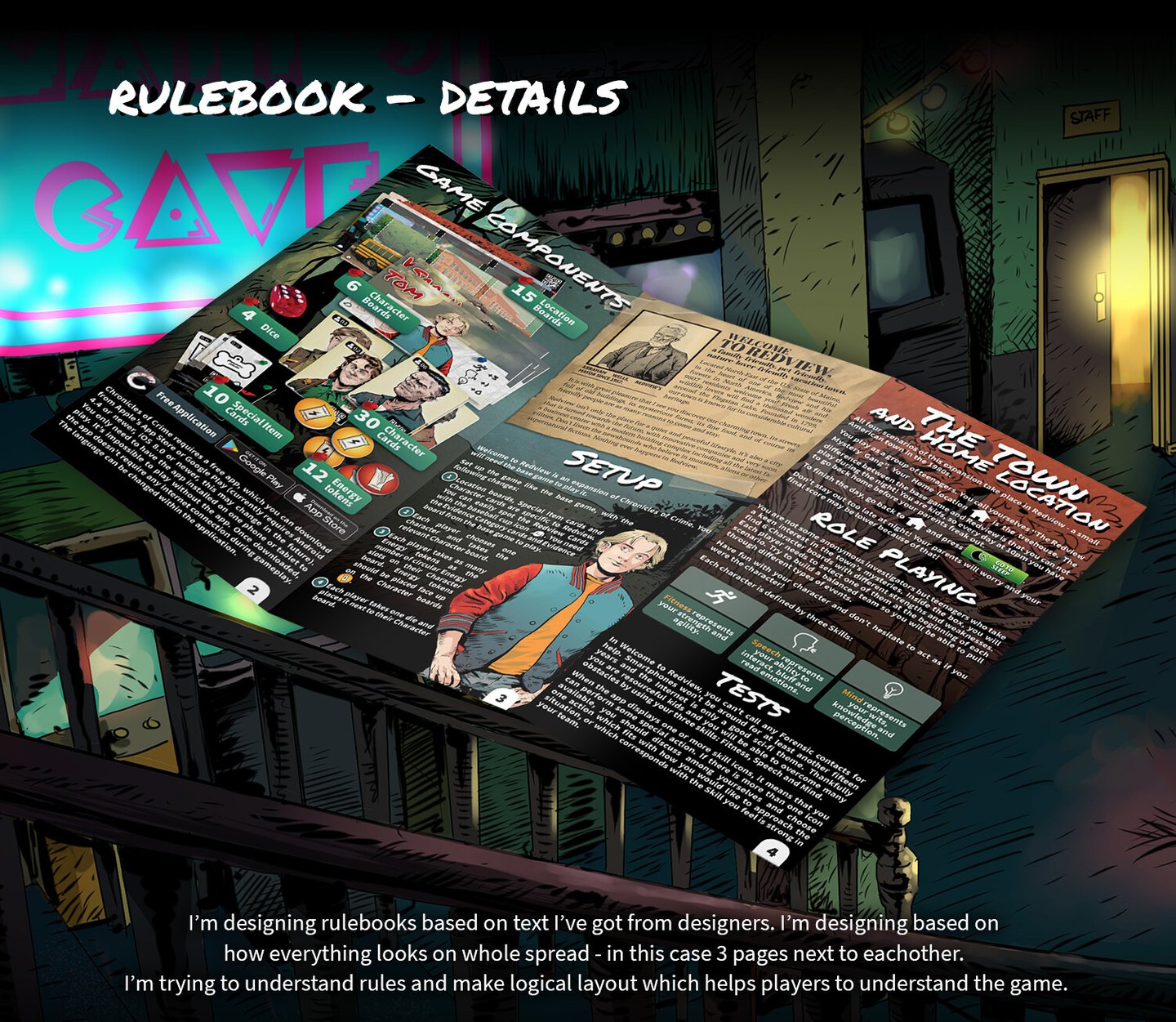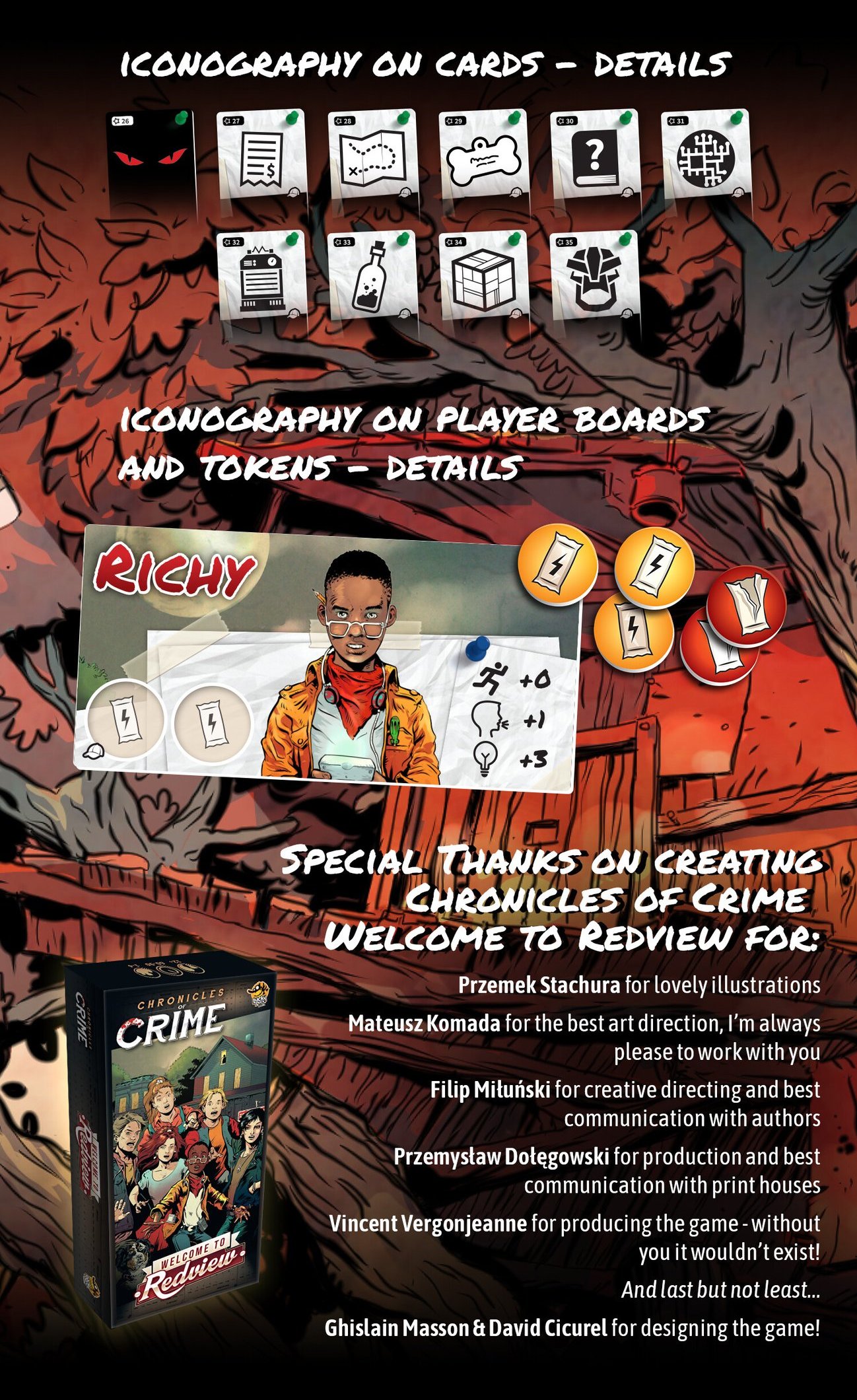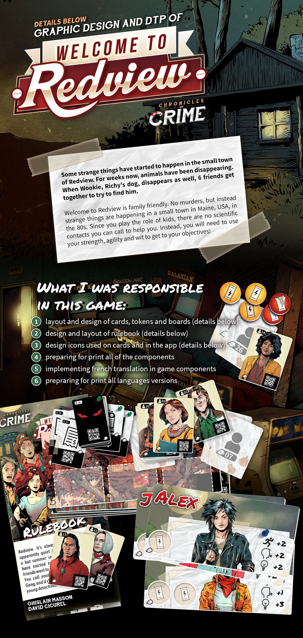 I Was responsible for layout and design of cards and boards, and rulebook. I also designed icons used on cards and in the app. I prepared all components to print. I worked on localization of Chronicles of Crime board game components for French speaking consumers, and preparing all languages versions to print.